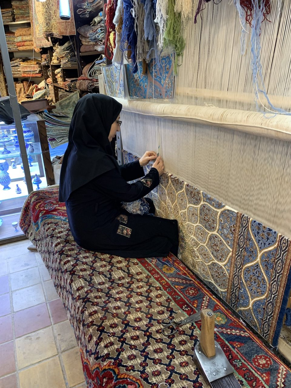 Am meisten beeindruckt uns das Kunsthandwerk. Zwei Jahre (!) knüpft die Frau bis zur Fertigstellung an diesem einen Teppich.