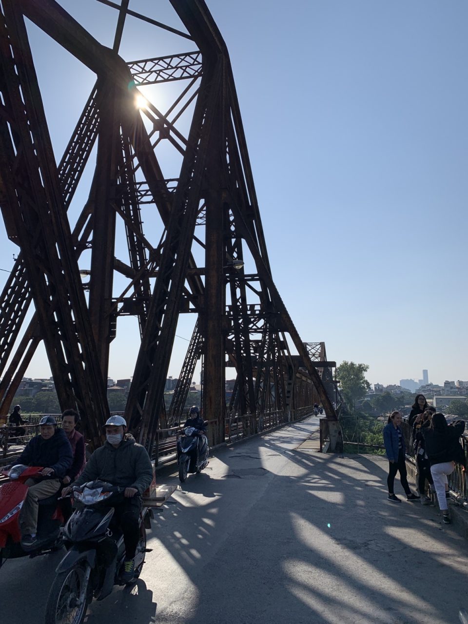 Hier geht es über die berühmte Long Bien Brücke, die während des Vietnam Krieges mehrmals zerstört und wieder aufgebaut wurde.