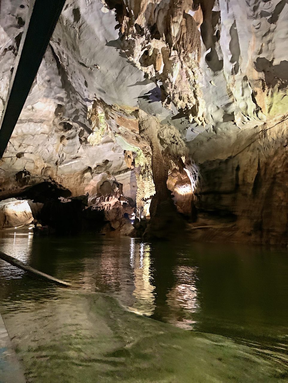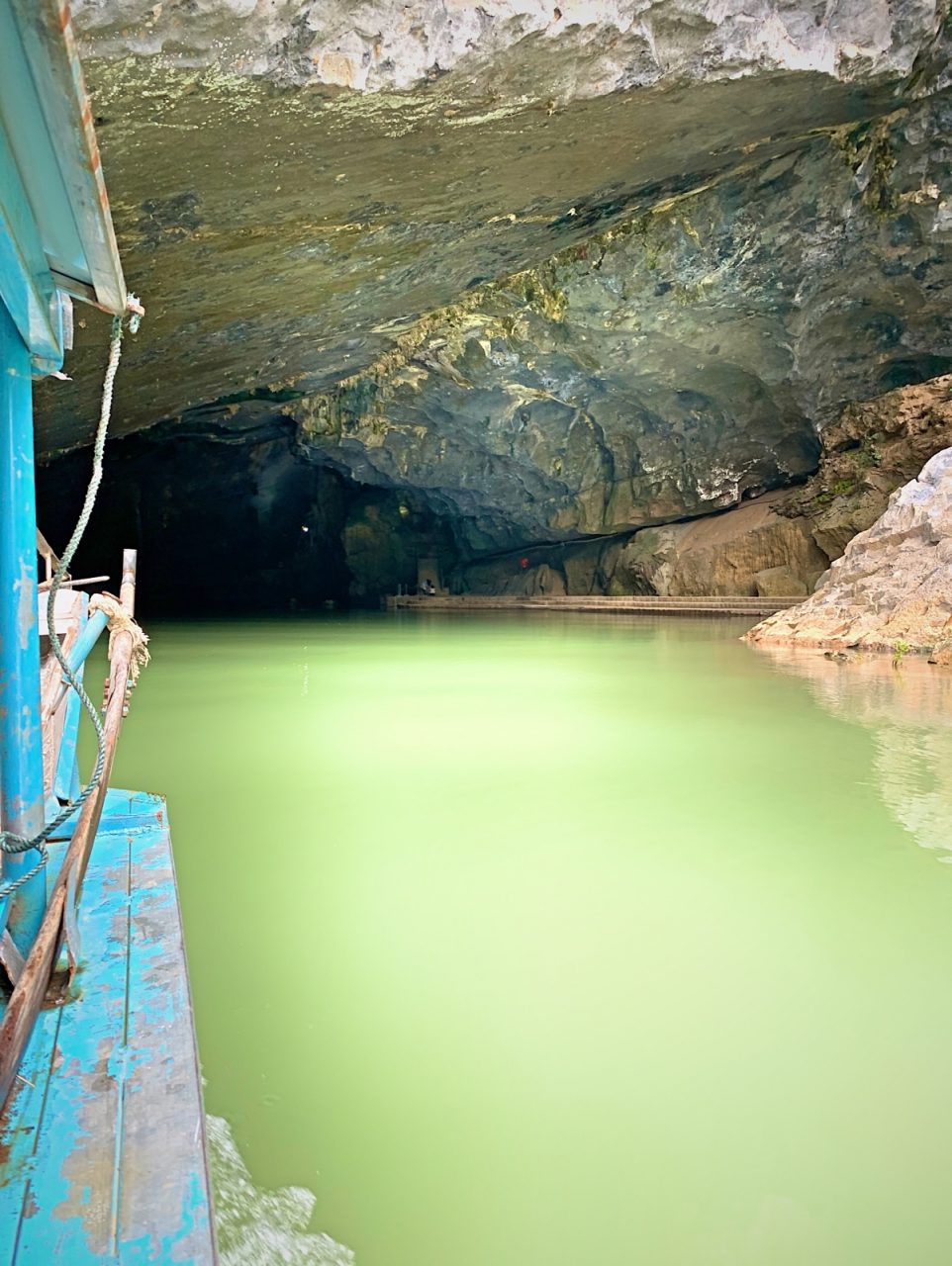 Bei unseren letzten Höhlen Touren mussten wir öfter den Kopf einziehen. Diesmal ist das anders (zum Größenvergleich siehe das Boot am linken Bildrand.
