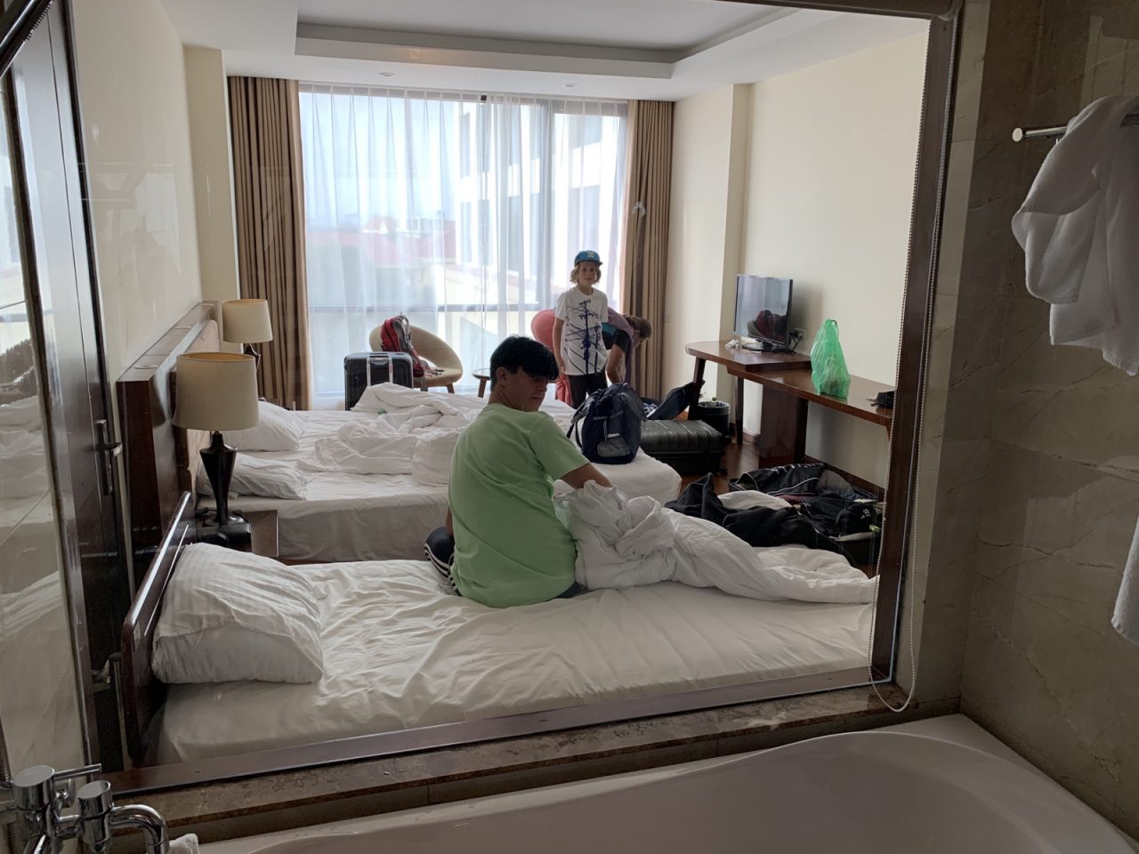 Am Abend sehnen wir uns alle nach einer wärmenden Badewanne in unserem chiquen Hotel (zur Erinnerung, unsere vorherige Nacht verbrachten wir im Tiefkühlwagon, in der Höhle haben wir uns auch nicht gerade gewärmt…). Als die erste Wanne halb voll ist, kommt nur mehr lauwarmes Wasser 😩. Der Hotel Techniker kann nicht weiterhelfen, so werfen wir den Wasserkocher im Zimmer an. Was für ein Tag.