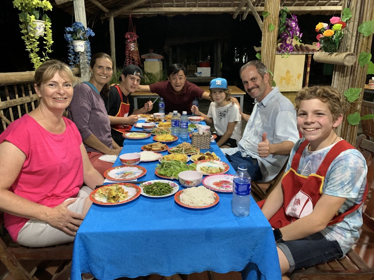 Zuletzt die Belohnung, ein super leckeres Essen (im Vordergrund eine australische Mutter mit ihrem Sohn, im Hintergrund Mr. Cu)