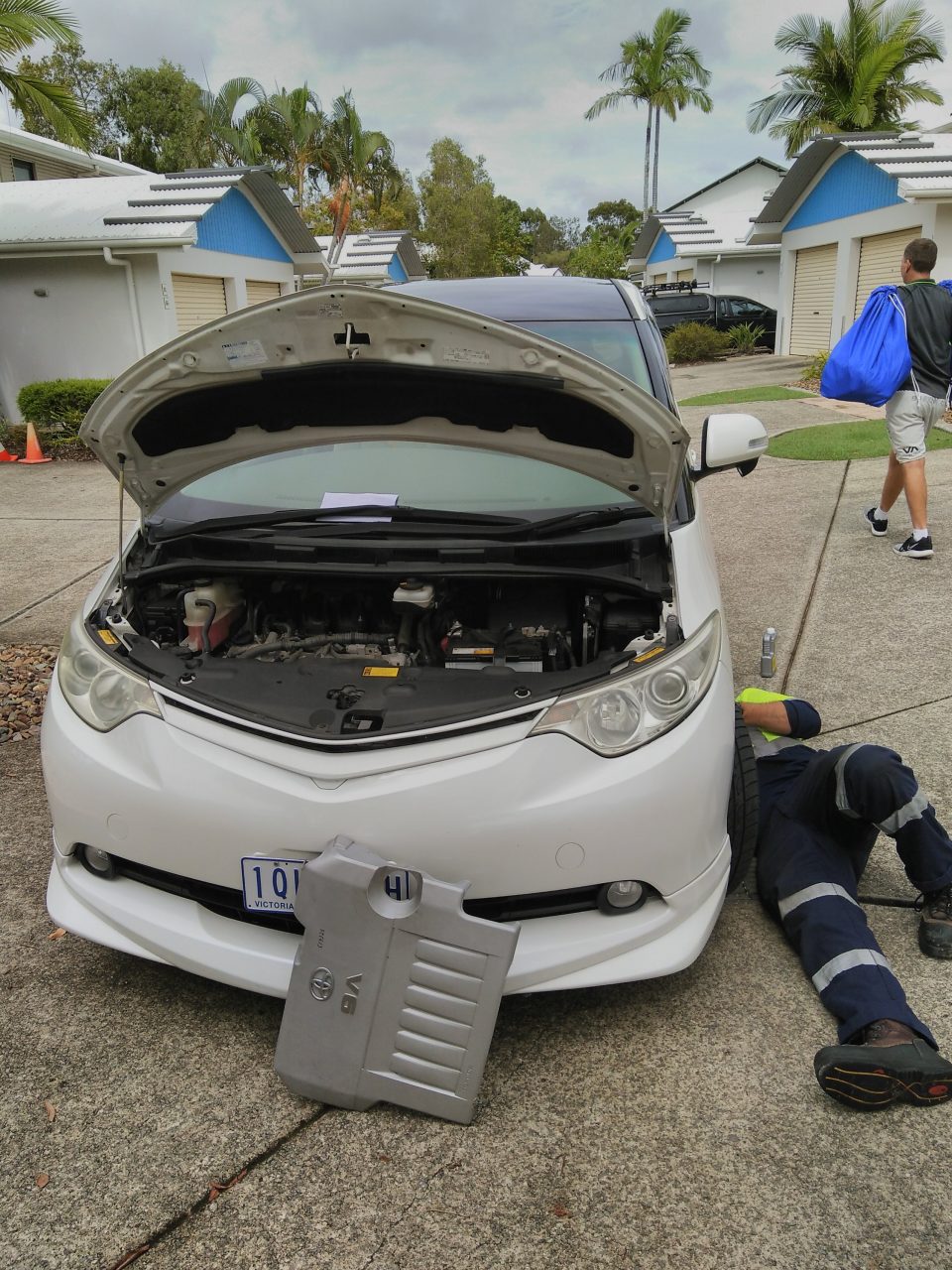 RACQ Mitarbeiter unterm wagen ( RA steht übrigens nicht wie ich dachte für Road Assistence sondern für: Royal Automobil Club Queensland) Windsor quasi 🙂
